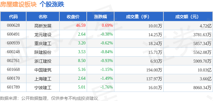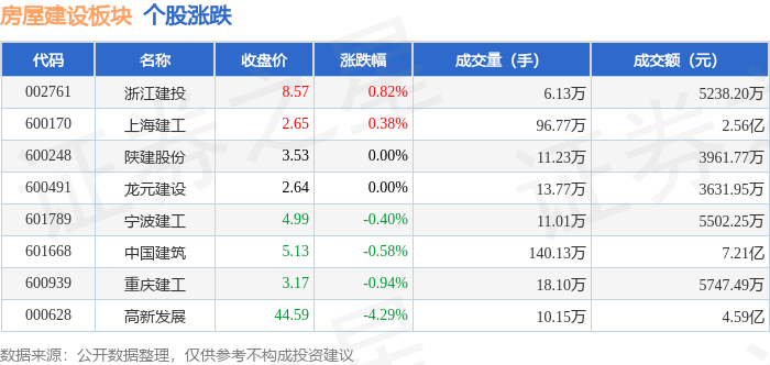证券之星消息,12月31日房屋建设板块较上一交易日下跌0.54%,高新发展领跌。当日上证指数报收于 3968.84,上涨0.09%。深证成指报收于13525.02,下跌0.58%。房屋建设板块个股涨跌见下表: | 代码 | 名称 | 收盘价 | 涨跌幅 | 成交量(手) | 成交额(元) | | --- | --- | --- | --- | --- | --- | | 002761 | 浙江建投 | 8.57 | 0.82% | 6.13万 | 5238.20万 | | 600170 | 上海建工 | 2.65 | 0.38% | 96.77万 | 2.56亿 | | 600248 | 陕建股份 | 3.53 | 0.00% | 11.23万 | 3961.77万 | | 600491 | 龙元建设 | 2.64 | 0.00% | 13.77万 | 3631.95万 | | 601789 | 宁波建工 | 66'7 | -0.40% | 11.01万 | 5502.25万 | | 601668 | 中国建筑 | 5.13 | -0.58% | 140.13万 | 7.21亿 | | 600939 | 重庆 ...