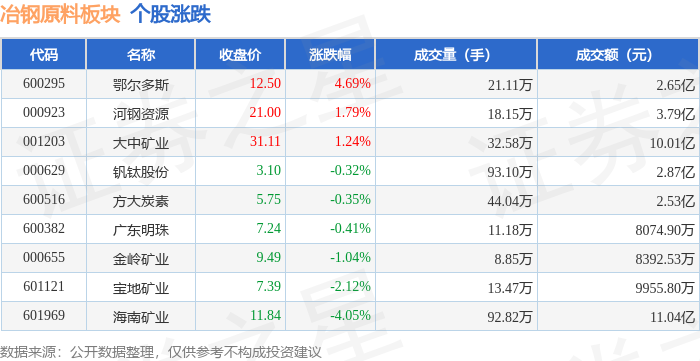 从资金流向上来看,当日冶钢原料板块主力资金净流出2.67亿元,游资资金净流出2548.11万元,散户资 金净流入2.92亿元。冶钢原料板块个股资金流向见下表: | 代码 | 名称 | 主力净流入(元) | 主力净占比 游资净流入 (元) | | 游资净占比 散户净流入 (元) | | 散户净占比 | | --- | --- | --- | --- | --- | --- | --- | --- | | 600295 | 鄂尔多斯 | > 69.41万 | 0.26% | 2157.01万 | 8.13% | -2226.42万 | -8.39% | | 000655 金岭矿业 | | -627.43万 | -7.48% | -445.23万 | -5.31% | 1072.66万 | 12.78% | | 600382 广东明珠 | | -1141.42万 | -14.14% | 575.25万 | 7.12% | - 566.17万 | 7.01% | | 601121 宝地矿业 | | -1263.04万 | -12.69% | -154.94万 | -1.56% | 1417.98万 | 14.24% ...