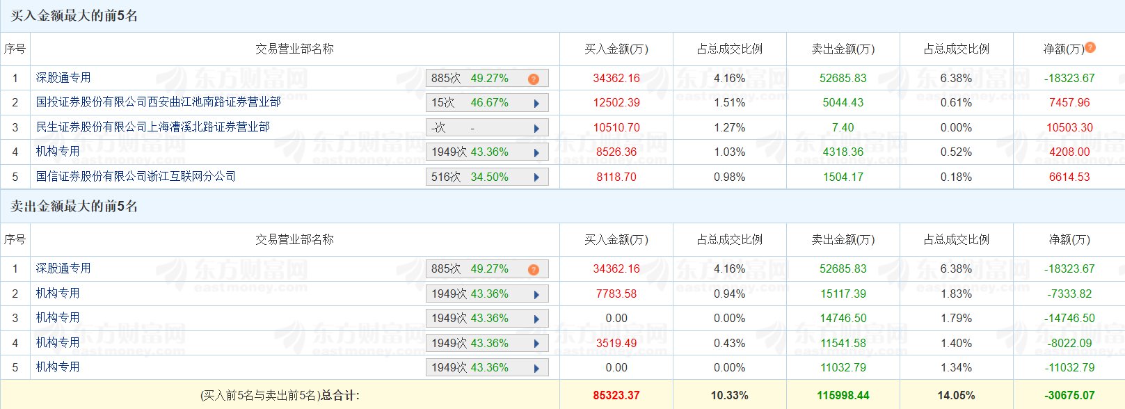| 序号 | | 交易营业部名称 | | 买入金额(万) | 占总成交比例 | | --- | --- | --- | --- | --- | --- | | | 深股通专用 | | 885次 49.27% (7) | 34362.16 | 4.16% | | 2 | 机构专用 | easimoney.com | 1949次 43.36% | 7783.58 | 0.94% | | 3 | 机构专用 | | 1949次 43.36% | 0.00 | 0.00% | | 4 | 机构专用 | | 1949次 43.36% | 3519.49 | 0.43% | | 5 | 机构专用 | | 1949次 43.36% | 0.00 | 0.00% | | | | (买入前5名与卖出前5名)总合计: | | 85323.37 | 10.33% | 铜陵有色(000630.SZ)今日涨停两连板,换手率10.02%,成交额82.57亿元。龙虎榜数据显示,深股通买入3.44亿元,卖出5.27亿元,净卖出1.83亿元;五家机 构买入5.38亿元,卖出9.02亿元,净卖出3.64亿元;游资"曲江池"位列买二席位,净买入74 ...