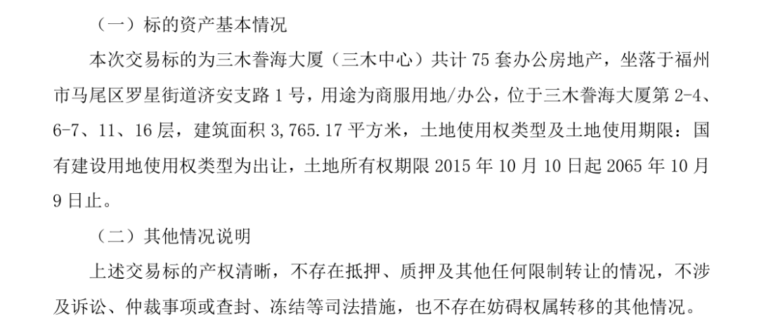 三木集团称,本次拟出售资产的目的是为了进一步盘活公司现有资产,改善公司财务状况,增强资产流动性,符合公司的长远发展目标。本次交易预计将 对公司财务状况和经营成果产生影响,本次交易金额2410.68万元,出售该资产需预征土地增值税及其他税金约34.28万元,预计可为公司直接带来现金流 入2376.40万元,公司本次交易标的账面价值约为4306.06万元,本次交易预计将影响公司当期损益约-1929.66万元,以上影响金额最终以实际缴纳税金及 年度审计会计师确认后的结果为准。 公开资料显示,三木集团于1996年在深交所上市,业务覆盖房地产开发、商业旅游资产运营、进出口贸易等。 12月10日晚间,三木集团(000632)(000632)公告称,公司全资子公司福建三木滨江建设发展有限公司(以下简称"三木滨江")拟将名下持有位于福州 市马尾区罗星街道济安支路1号三木誉海大厦(三木中心)共计75套办公房地产出售给福州保税港国利集团有限公司(以下简称"国利集团"),交易价格 为2410.68万元。 值得注意的是,三木集团总裁林向辉同时担任国利集团董事,根据《深圳证券交易所股票上市规则》《公司章程》等有关规定,国利集团为三木集 ...