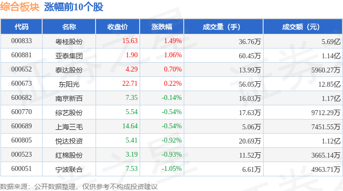 | 代码 | 名称 | 收盘价 | 涨跌幅 | 成交量(手) | 成交额(元) | | --- | --- | --- | --- | --- | --- | | 000421 | 南京公用 | 6.81 | -1.30% | 33.02万 | 2.25亿 | | 000753 | 漳州发展 | 7.45 | -0.40% | 28.56万 | 2.11亿 | | 000025 | 特力A | 17.56 | 0.92% | 6.89万 | 1.21亿 | | 600689 | 上海三毛 | 14.40 | 0.98% | 1 5.22万 | 7456.86万 | | 600805 | 倪达投资 | 5.26 | 1.35% | 15.63万 | 8167.14万 | | 002758 | 浙衣服份 | 9.13 | 1.44% | 7.15万 | 6509.53万 | | 000523 | 红棉股份 | 3.23 | 1.57% | 18.81万 | 6045.82万 | | 600682 | 南京新百 | 7.61 | 2.01% | 15.56万 | 1.18亿 | | 600051 | 宁波联合 | ...