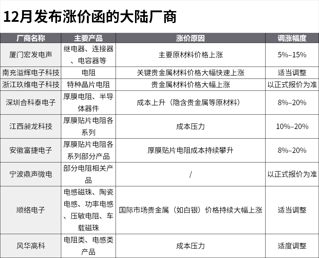 行业动态:被动元件涨价潮启动 - 继陆资被动元件龙头风华高科之后,二线陆资芯片电阻厂安徽富捷电子跟进发出涨价通知,将调涨厚膜电阻价格8%至20% [1] - 台湾被动元件厂预期,有陆资龙头领涨、二线厂跟涨,有望迎来芯片电阻涨价潮 [1] 公司行动:富捷电子减产与涨价 - 安徽富捷电子在12月初发出减产通知,将自砍产能20%至60%,并示警交期延长 [1] - 时隔不到一个月,富捷电子正式发出厚膜电阻涨价通知,调涨幅度为8%至20% [1] - 富捷电子在通知中解释,涨价主因是全球关键金属原材料价格大幅上涨,其中银价对比去年同期上涨逾100% [1] 涨价驱动因素:成本与需求 - 关键金属原材料如银、钯、钌、镍、锡等价格大幅上涨,尤其银价和铜价迭创新高,成为推升被动元件价格的引爆点 [1] - AI基建带动伺服器、机柜、电力电源架构系统需求,持续吞食被动元件产能 [1] - AI伺服器芯片电阻用量约为通用伺服器的1至2倍 [2] 市场观点与展望 - 台湾被动元件厂认为,富捷减产其实就是涨价前奏,目前芯片电阻价格已止血 [2] - 在材料高涨的成本压力下,其余陆资厂可望迎来全面涨价潮,有助于恢复产业秩序 [2] - 台系芯片电阻厂光颉表示,陆资芯片电阻厂加入减产行列,减产幅度达10%至20%,有助芯片电阻供给面收敛 [2] - 由于近年电阻未见大规模增产,供需结构改善,看好2026年芯片电阻市况,有机会在2025年下半年迎接涨价契机 [2] 涨价产品范围扩大 - 随着芯片电阻价格看涨,被动元件全面性涨势蠢动 [1] - 包括钽质电容、积层芯片电感及磁珠、薄膜电感、厚膜电阻、铝箔等相继加入涨价行列 [1]