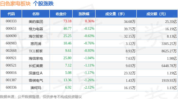 证券之星消息,10月16日白色家电板块较上一交易日下跌0.02%,澳柯玛领跌。当日上证指数报收于 3916.23,上涨0.1%。深证成指报收于13086.41,下跌0.25%。白色家电板块个股涨跌见下表: | 代码 | 名称 | 收盘价 | 涨跌幅 | 成交量(手) | 成交额(元) | | | --- | --- | --- | --- | --- | --- | --- | | 000333 | 美的集团 | 73.18 | 0.36% | 34.68万 | | 25.35 Z | | 000651 | 格力电器 | 40.77 | -0.12% | 39.75万 | | 16.19亿 | | 600690 | 海尔智家 | 25.25 | -0.63% | 32.15万 | | 8.13 亿 | | 600983 | 惠而浦 | 10.46 | -0.76% | - 3.12万 | | 3305.25万 | | 002668 | TCL智家 | 9.61 | -0.93% | 8.93万 | | 8625.27万 | | 000921 | 海信家电 | 25.80 | -1.04% | 7.63万 | ...