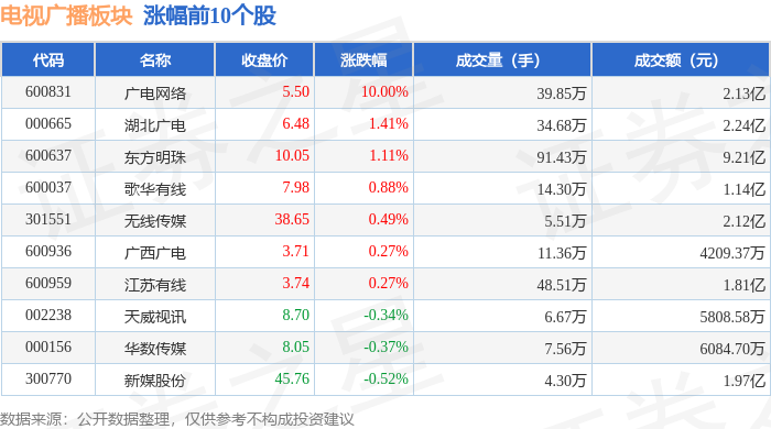 板块整体表现 - 11月4日电视广播板块整体上涨0.49%,表现优于大盘,当日上证指数下跌0.41%,深证成指下跌1.71% [1] - 吉视传媒领涨板块,涨幅达10.07%,收盘价为4.48元,成交量为1063.27万手,成交额为44.82亿元 [1] - 板块内10只成分股中,7只上涨,3只下跌,湖北广电上涨2.04%,天威视讯上涨1.38% [1] 个股价格与成交 - 涨幅居前的个股包括吉视传媒(10.07%)、湖北广电(2.04%)、天威视讯(1.38%),跌幅最大的个股为流金科技(-2.75%)和贵广网络(-2.30%) [1][2] - 成交额最高的个股为东方明珠,达30.13亿元,成交量283.64万手,新媒股份成交额4.92亿元,吉视传媒成交额44.82亿元 [1][2] - 股价最高的个股为新媒股份,收盘价48.96元,股价最低的个股为江苏有线,收盘价3.74元 [1][2] 资金流向分析 - 电视广播板块整体呈现主力资金净流出4.51亿元,游资净流入1.61亿元,散户资金净流入2.9亿元 [2] - 主力资金净流入最多的个股为湖北广电,净流入2545.69万元,主力净占比4.24%,ST广网主力净流入206.16万元,占比4.63% [3] - 主力资金净流出最严重的个股为新媒股份,净流出3852.70万元,占比-7.83%,广西广电净流出1573.26万元,占比-19.40% [3] - 游资净流入最多的个股为贵广网络,净流入1696.93万元,占比7.99%,游资净流出最多的为湖北广电,净流出3895.46万元 [3]