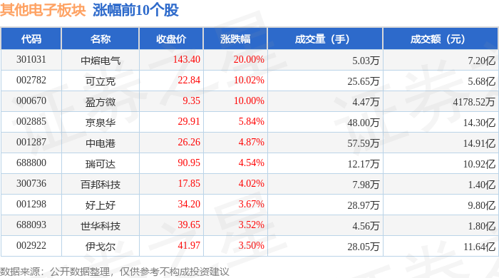 市场整体表现 - 2025年1月21日,其他电子板块整体上涨1.86%,表现显著强于大盘,当日上证指数上涨0.08%,深证成指上涨0.7% [1] - 板块内个股表现分化,领涨股中熔电气涨停,涨幅达20.00%,可立克与盈方微亦涨停,涨幅分别为10.02%和10.00% [1] - 板块内亦有部分个股下跌,跌幅最大的久之洋下跌2.38%,香农芯创下跌1.16% [2] 个股交易活跃度 - 从成交额看,京泉华、中电港、香农芯创成交活跃,成交额分别达14.30亿元、14.91亿元和69.36亿元 [1][2] - 从成交量看,力源信息、中电港、香农芯创成交量居前,分别成交62.28万手、57.59万手和41.80万手 [1][2] - 部分个股如中熔电气、盈方微在涨停情况下成交量相对较小,分别为5.03万手和4.47万手 [1] 板块资金流向 - 当日其他电子板块整体呈现主力资金净流出状态,净流出金额为3.34亿元 [2] - 与主力资金流向相反,游资与散户资金呈现净流入,净流入金额分别为1.81亿元和1.53亿元 [2] - 个股资金流向差异显著,中电港、中熔电气、可立克主力资金净流入居前,分别净流入2.04亿元、1.58亿元和1.48亿元 [3] 领涨个股分析 - 中熔电气为板块领涨股,股价收于143.40元,涨停且成交额达7.20亿元,同时获得主力资金净流入1.58亿元,主力净占比高达21.93% [1][3] - 可立克股价收于22.84元,涨停且成交额达5.68亿元,主力资金净流入1.48亿元,主力净占比为26.09% [1][3] - 盈方微股价收于9.35元,涨停但成交额相对较低,为4178.52万元,其主力资金净流入2744.79万元,主力净占比高达65.69% [1][3]