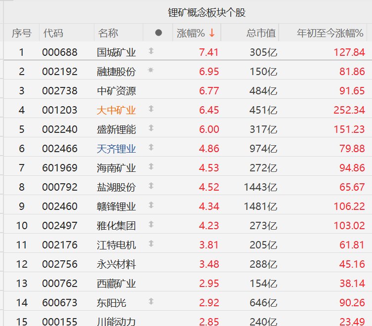 | 代码 | 名称 | | 涨幅% ↓ | 总市值 | 年初至今涨幅%。 | | --- | --- | --- | --- | --- | --- | | 002240 | 盛新锂能 | 1 | 10.01 | 329亿 | 160.74 | | 002192 | 融围股份 | 1 | 10.01 | 154亿 | 87.06 | | 001203 | 大中矿业 | 1 | 10.01 | 466亿 | 264.12 | | 002497 | 雅化集团 | 1 | 10.00 | 288亿 | 114.26 | | 000688 | 国城矿业 | 1 | 9.99 | 312亿 | 133.31 | | 000546 | 金圆股份 | 海 | 9.98 | 48.84 乙 | 27.38 | | 002738 | 中矿资源 | 来 | 9.73 | 497亿 | 96.96 | | 002466 | 天齐锂业 | 1 | 9.40 | 1016亿 | 87.67 | | 600773 | 西藏城投 | 1 | 8.69 | 134亿 | 31.21 | | 002756 | 永兴材料 | | 8.09 | ...