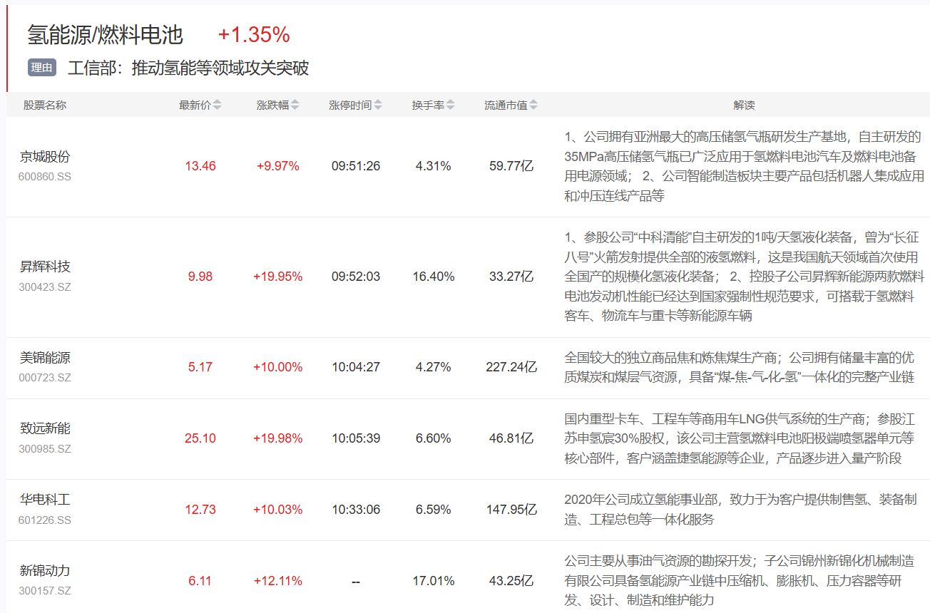 氢能源概念表现活跃 京城股份涨停