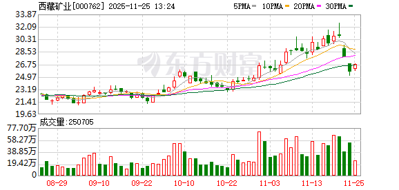 11月25日,西藏矿业盘中上涨2.02%,截至10:43,报26.22元/股,成交3.85亿元,换手率2.84%,总市值 136.56亿元。 资金流向方面,主力资金净流出5030.42万元,特大单买入1614.97万元,占比4.20%,卖出4480.54万 元,占比11.64%;大单买入7050.70万元,占比18.32%,卖出9215.56万元,占比23.95%。 西藏矿业今年以来股价涨22.24%,近5个交易日跌11.81%,近20日涨6.80%,近60日涨15.81%。 分红方面,西藏矿业A股上市后累计派现4.14亿元。近三年,累计派现3.29亿元。 机构持仓方面,截止2025年9月30日,西藏矿业十大流通股东中,香港中央结算有限公司位居第二大流 通股东,持股533.17万股,相比上期增加168.99万股。南方中证1000ETF(512100)位居第四大流通股 东,持股381.45万股,相比上期减少3.25万股。华夏中证1000ETF(159845)位居第七大流通股东,持 股226.61万股,相比上期减少5200.00股。汇添富中证新能源汽车产业指数(LOF)A(501057)位居第八 大流通股东,持股 ...