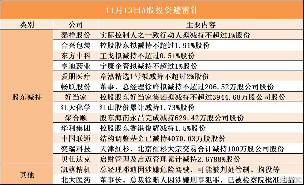 泰祥股份实际控制人之一致行动人拟减持不超过1%股份;合兴包装控股股东拟减持不超过1.91%股份;东方中科股东王戈拟减持不超过 0.51%股份;亨迪药业股东宁康企管拟减持不超过1%股份;爱朋医疗股东章泓精选1号拟减持不超过2%股份;畅联股份董事、总经理徐峰 拟减持不超过206.52万股公司股份;好当家控股股东好当家集团拟减持不超过3944.68万股公司股份; 奕瑞科技股东天津红杉、北京红杉 大宗交易合计减持100万股公司股份;贝仕达克股东启财管理及启迈管理累计减持2.6788%股份;凯格精机总经理邓迪因涉嫌危险驾驶,可 能被判处管制、拘役等;北大医药董事长、总裁徐晰人因涉嫌刑事犯罪,已被检察院批准逮捕 | | | 11月13日A股投资避雷针 | | --- | --- | --- | | 类别 | 公司 | 主要内容 | | | 奏祥股份 | 实际控制人之一致行动人拟减持不超过1%股份 | | | 合兴包装 | 控股股东拟减持不超过1.91%股份 | | | 东方中科 | 王戈拟减持不超过0.51%股份 | | | 亨曲药业 | 宁康企管拟减持不超过1%股份 | | | 爱朋医疗 | 章泓精选1号拟减持不超过2 ...
