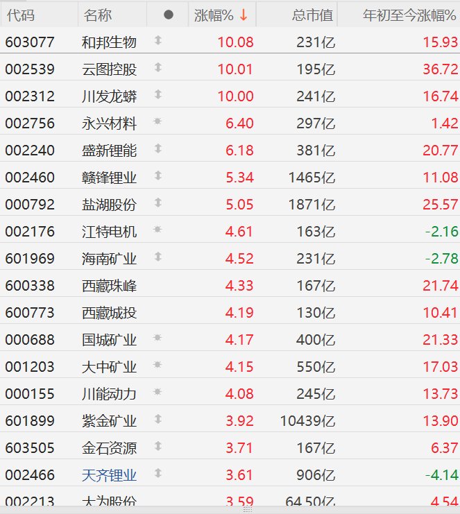 A股异动丨锂矿股集体走强,永兴材料、盛新锂能涨超6%
