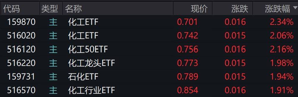 化工板块市场表现 - 化工概念股午后走高,恒力石化股价上涨超过5%,盐湖股份和华鲁恒升股价上涨超过4% [1] - 受盘面影响,化工ETF上涨约2% [1] - 具体ETF表现:化工ETF(代码159870)现价0.701元,上涨0.016元,涨幅2.34%;化工ETF(代码516020)现价0.742元,上涨0.015元,涨幅2.06% [2] - 化工50ETF(代码516120)现价0.756元,上涨0.016元,涨幅2.16%;化工龙头ETF(代码516220)现价0.773元,上涨0.015元,涨幅1.98% [2] - 石化ETF(代码159731)现价0.789元,上涨0.015元,涨幅1.94%;化工行业ETF(代码516570)现价0.854元,上涨0.016元,涨幅1.91% [2] 行业基本面与投资观点 - 券商观点认为化工品盈利可能已经筑底,基本面下行风险充分释放 [2] - 化工白马股有望迎来估值与盈利的双击修复 [2] - 供给短缺约束的行业将率先迎来弹性 [2] - 建议关注需求确定性向上的方向,并重视化工高分红资源股的价值重估 [2]