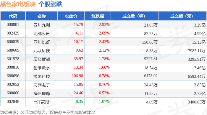 证券之星消息,10月21日黑色家电板块较上一交易日上涨1.84%,四川九洲领涨。当日上证指数报收于 3916.33,上涨1.36%。深证成指报收于13077.32,上涨2.06%。黑色家电板块个股涨跌见下表: | 代码 | 名称 | 主力净流入(元) | 主力净占比 游资净流入 (元) | | 游资净占比 散户净流入 (元) | | 散户净占比 | | --- | --- | --- | --- | --- | --- | --- | --- | | 600839 四川长虹 | | 9188.11万 | 6.07% | -5715.36万 | -3.78% | -3472.75万 | -2.29% | | 002429 | 非驰股份 | 8473.59万 | 16.97% | -2957.94万 | -5.92% | -5515.65万 | -11.05% | | 000810 | 创维数字 | 1663.18万 | 6.77% | -1971.00万 | -8.02% | - 307.81万 | 1.25% | | 000801 | 四川九洲 | 631.68万 | 1.92% | -2703.34万 | ...