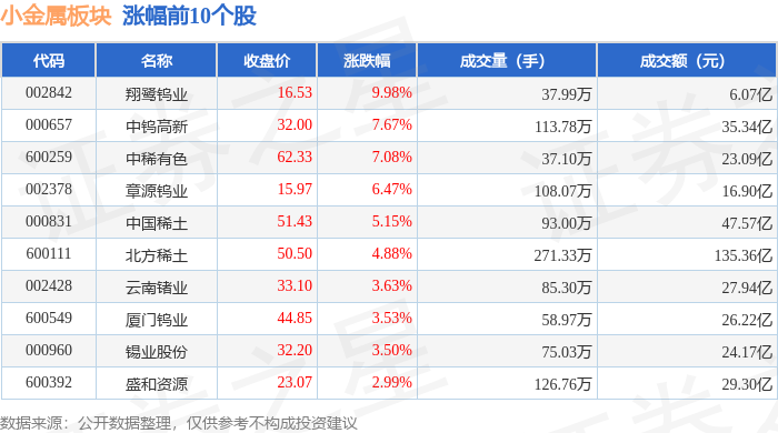 | 代码 | 名称 | 收盘价 | 涨跌幅 | 成交量(手) | 成交额(元) | | --- | --- | --- | --- | --- | --- | | 002842 | 翔鹭钨业 | 16.53 | 9.98% | 37.99万 | 6.07亿 | | 000657 | 中钨高新 | 32.00 | 7.67% | 113.78万 | 35.34亿 | | 600259 | 中稀有色 | 62.33 | 7.08% | 37.10万 | 23.09亿 | | 002378 | 章源钨业 | 15.97 | 6.47% | 108.07万 | 16.90亿 | | 000831 | 中国稀土 | 51.43 | 5.15% | 93.00万 | 47.57 Z | | 600111 | 北方稀土 | 50.50 | 4.88% | 271.33万 | 135.36亿 | | 002428 | 云南错业 | 33.10 | 3.63% | 85.30万 | 27.94亿 | | 600549 | 厦门钨业 | 44.85 | 3.53% | 58.97万 | 26.22亿 | | 000960 | 锡 ...