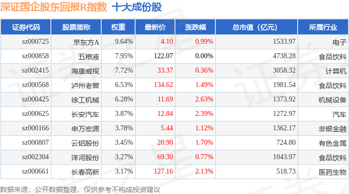 | 证券代码 | 股票简称 | 权重 | 最新价 | 涨跌幅 | 总市值(亿元) | 所属行业 | | --- | --- | --- | --- | --- | --- | --- | | sz000725 | 京东方A | 9.64% | 4.10 | - 0.99% | 1533.97 | 电子 | | sz000858 | 五粮液 | 7.95% | 122.07 | 0.00% | 4738.28 | 食品饮料 | | sz002415 | 海康威视 | 7.72% | 33.37 | 0.36% | 3058.32 | 计算机 | | sz000568 | 泸州老窖 | 6.53% | 134.62 | 1.49% | 1981.54 | 食品饮料 | | sz000425 | 徐工机械 | 6.28% | 11.69 | 2.63% | 1373.92 | 机械设备 | | sz000625 | 长安汽车 | 3.87% | 12.84 | 2.39% | 1272.97 | 汽车 | | sz000166 | 申万宏源 | 3.78% | 5.44 | 1.12% | 1362.17 | 非银 ...
