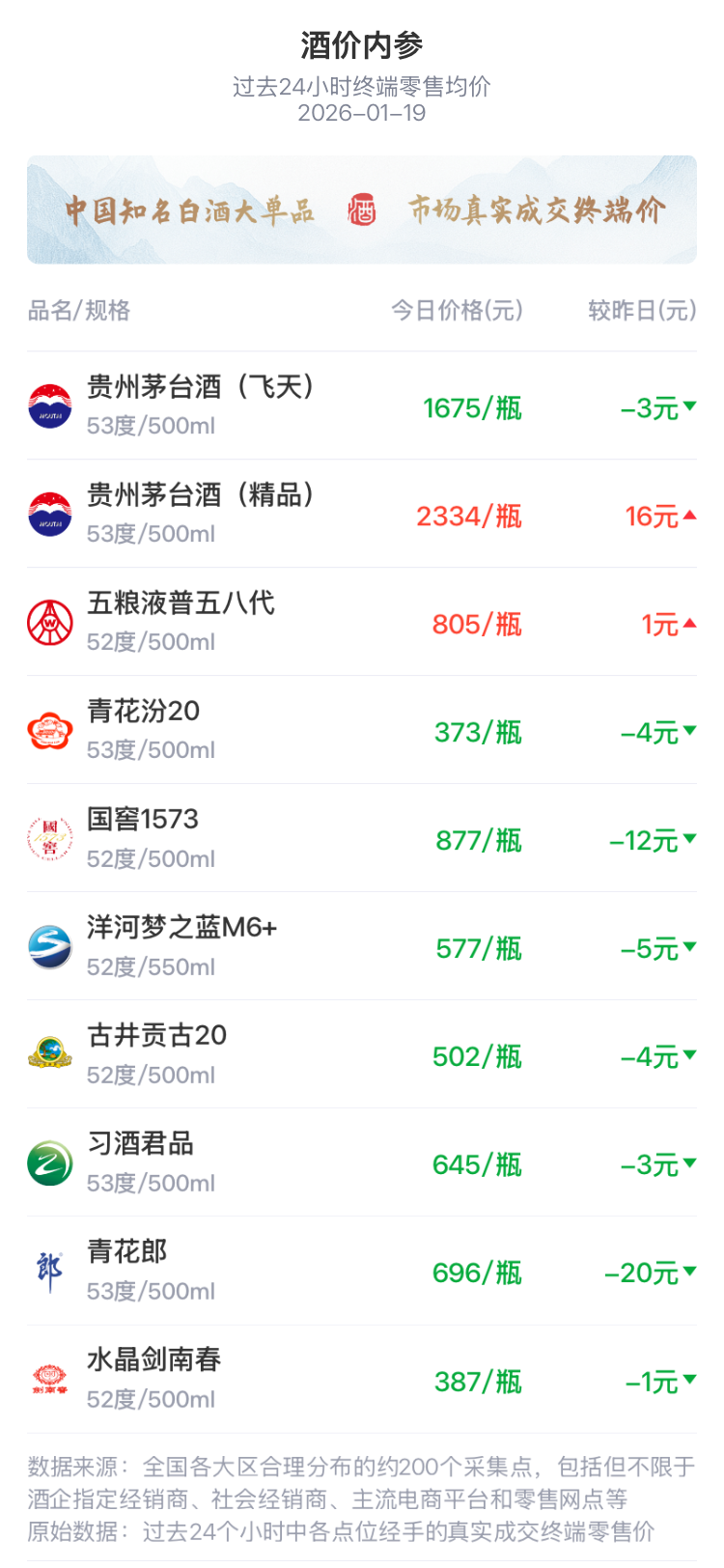 酒价内参1月19日价格发布 十大单品整体均价再创近两月新低