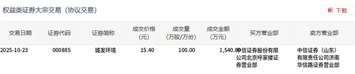 交易概况 - 2025年10月23日,城发环境发生大宗交易,成交量为100万股,成交金额为1540万元[1] - 该笔大宗交易成交价15.4元,较市场收盘价15.54元折价0.9%[1] - 此次大宗交易成交额占公司当日总成交额的14.48%[1] 交易细节 - 买方营业部为信证券股份有限公司北京呼家楼证券营业部[2] - 卖方营业部为中信证券(山东)有限责任公司济南华信路证券营业部[2] - 证券代码为000882[2]