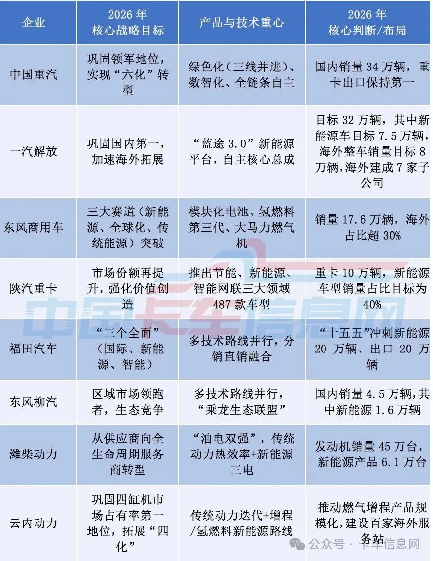 随着各主流卡车及发动机企业相继召开2026年商务年会,今年的市场图景与战略路线的清晰画卷正徐徐展开。综合中国重 汽、一汽解放、东风商用车、陕汽、福田、东风柳汽、潍柴、云内动力等企业的预判与规划,可以清晰地看到,行业已形成 高度共识:市场正从增量扩张时代转入存量价值深耕的新周期,竞争的核心从单一的产品价格比拼,全面转向为用户提供全 生命周期价值(TCO)的综合能力较量。 一、行业共识:存量博弈下的三大确定性趋势 尽管各企业对2026年市场总量的具体预测存在小幅差异,但普遍认同市场将进入 "高位盘整、结构分化"的阶段。中国重汽、 一汽解放、陕汽等预计中重卡市场总量将在110万至125万辆区间,与2025年持平或微增,市场驱动力已从政策刺激转向存量 优化。 在此背景下,三大趋势成为所有企业的战略锚点: 由上表分析可见,头部整车企业(如中国重汽、一汽解放)的战略更为宏大和系统,致力于打造从技术、产品到全球生态的 全面领先优势。而第二梯队企业(如东风柳汽)则更强调聚焦区域或细分市场,通过构建紧密的生态联盟实现差异化竞争。 作为核心动力供应商,潍柴和云内动力的战略则体现了"不把所有鸡蛋放在一个篮子里"的务实思路,在极致优 ...