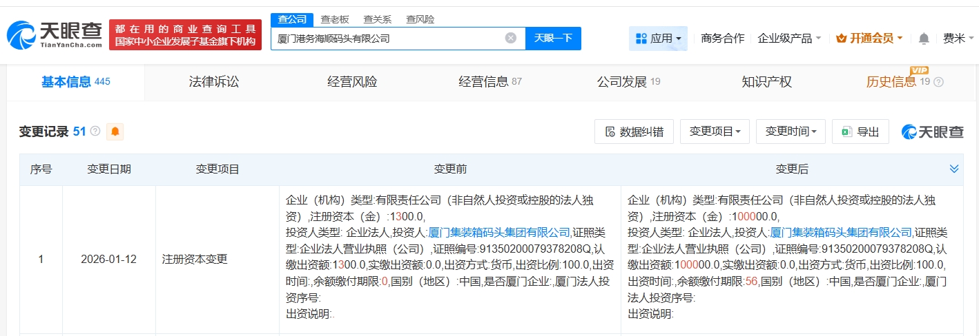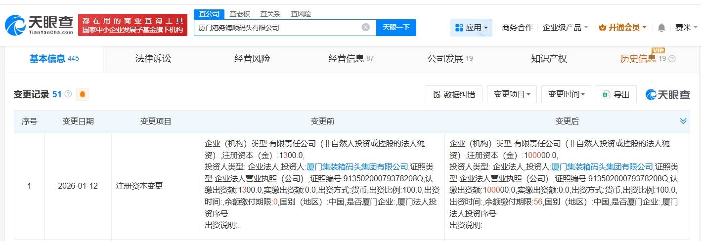 每经AI快讯,1月15日,天眼查工商信息显示,近日,厦门港务海顺码头有限公司发生工商变更,注册资本由1300万元人民币增至10亿元人民币,增幅约 7592%。厦门港务海顺码头有限公司成立于2015年8月,法定代表人为洪宝财,经营范围为港口经营、港口货物装卸搬运活动、船舶港口服务、港口设施设 备和机械租赁维修业务。股东信息显示,该公司由厦门集装箱码头集团有限公司全资持股。 | 都在用的商业查询工具 | | 意公司 童老板 直关系 查风险 | | | | | --- | --- | --- | --- | --- | --- | | 国家中小企业发展子基金旗下机构 | | 印公路刷术的遗史智慧 | × 大眼一下 | 一周周五 商务合作 | | | 基本信息 445 | 法律诉讼 | 经营风险 | 经营信息 87 | 公司发展 19 | 知 | | 变更记录 51 3 ● | | | | 园 数据纠错 | 变量项目, | | 序号 | 变更目期 变更项目 | 变更前 | | | | | 1 | 2026-01-12 注册资本变更 | 企业(机构)类型:有限责任公司(非自然人投资或控股的法人独 资) 注册资本(金): ...