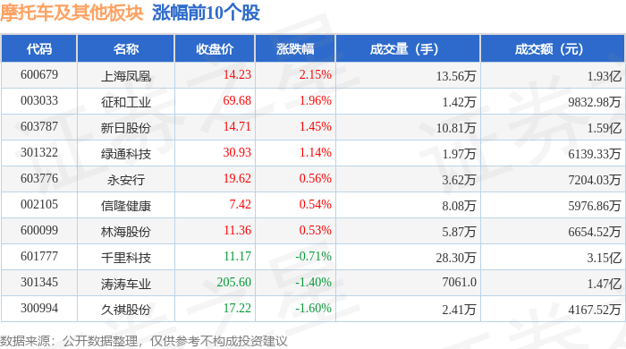 证券之星消息,11月17日摩托车及其他板块较上一交易日下跌2.56%,九号公司领跌。当日上证指数报收于3972.03,下跌0.46%。深证成指报收于 13202.0,下跌0.11%。摩托车及其他板块个股涨跌见下表: | 代码 | 名称 | 收盘价 | 涨跌幅 | 成交量(手) | 成交额(元) | | | --- | --- | --- | --- | --- | --- | --- | | 600679 | 上海凤凰 | 14.23 | 2.15% | 13.56万 | | 1.93亿 | | 003033 | 征和工业 | 69.68 | 1.96% | 1.42万 | | 9832.98万 | | 603787 | 新日股份 | 14.71 | 1.45% | - 10.81万 | | 1.59亿 | | 301322 | 绿通科技 | 30.93 | 1.14% | 1.97万 | | 6139.33万 | | 603776 | 永安行 | 19.62 | 0.56% | 3.62万 | | 7204.03万 | | 002105 | 信隆健康 | 7.42 | 0.54% | 8.08万 | | 5 ...