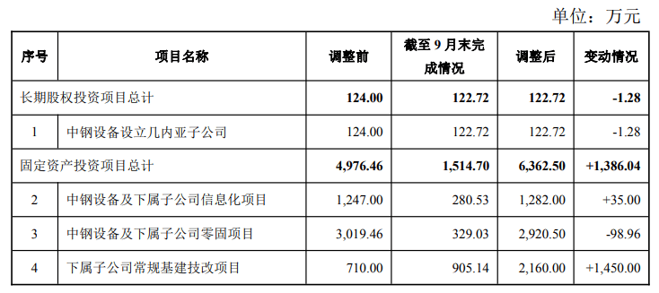 2025年中期,中钢国际实现收入67.45亿元,归母净利润4.24亿元。 | 序号 | 项目名称 | 调整前 | 截至9月末完 成情况 | 调整后 | 变动情况 | | --- | --- | --- | --- | --- | --- | | 长期股权投资项目总计 | | 124.00 | 122.72 | 122.72 | -1.28 | | 1 中钢设备设立几内亚子公司 | | 124.00 | 122.72 | 122.72 | -1.28 | | 固定资产投资项目总计 | | 4,976.46 | 1,514.70 | 6,362.50 | +1,386.04 | | 2 | 中钢设备及下属子公司信息化项目 | 1,247.00 | 280.53 | 1,282.00 | +35.00 | | 3 中钢设备及下属子公司零固项目 | | 3.019.46 | 329.03 | 2.920.50 | -98.96 | | র্ব | 下属子公司常规基建技改项目 | 710.00 | 905.14 | 2.160.00 | +1.450.00 | 中钢国际(000928)发布公告,公司对2025年度投资计 ...