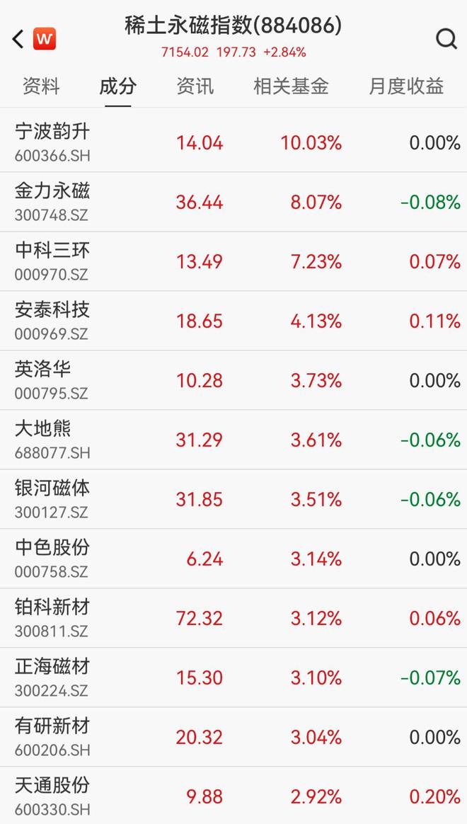 | < w | 稀土永磁指数(884086) | | O | | --- | --- | --- | --- | | | 7154.02 197.73 +2.84% | | | | 资料 成分 | 资讯 | 相关基金 | 月度收益 | | 宁波韵升 | 14.04 | 10.03% | 0.00% | | 600366.SH | | | | | 金力永磁 | 36.44 | 8.07% | -0.08% | | 300748.SZ | | | | | 中科三环 | 13.49 | 7.23% | 0.07% | | 000970.SZ | | | | | 安泰科技 | 18.65 | 4.13% | 0.11% | | 000969.SZ | | | | | 英洛卡 | 10.28 | 3.73% | 0.00% | | 000795.SZ | | | | | 大地熊 | 31.29 | 3.61% | -0.06% | | 688077.SH | | | | | 银河磁体 | 31.85 | 3.51% | -0.06% | | --- | --- | --- | --- | | 300127.SZ | | ...