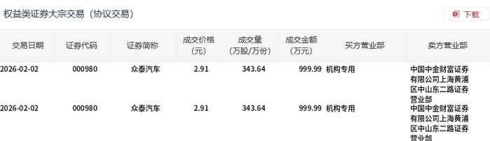 大宗交易概况 - 2026年2月2日,众泰汽车发生大宗交易,总成交量为687.28万股,总成交金额为1999.98万元,占该股当日总成交额的5.07% [1] - 本次大宗交易成交均价为2.91元,较当日市场收盘价3.07元折价5.21% [1] 交易明细分析 - 当日共发生两笔大宗交易,每笔成交量均为343.64万股,每笔成交金额均为999.99万元,成交价格均为2.91元 [2] - 两笔交易的买方均为“机构专用”席位,卖方均为中国中金财富证券有限公司上海黄浦区中山东二路证券营业部 [2]