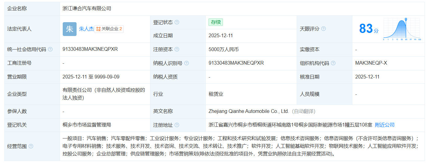 公司成立与基本信息 - 浙江谦合汽车有限公司于2025年12月11日正式成立,注册资本为5000万元人民币 [1][2] - 公司由上海山子有谦科技有限公司全资持股,持股比例为100%,朱人杰出任法定代表人及经理 [2] - 公司注册地址位于浙江省嘉兴市桐乡市梧桐街道环城南路1号桐乡国际新能源市场 [2] 业务经营范围 - 公司主营业务包括汽车销售、汽车零配件零售、工业设计服务、工程和技术研究和试验发展 [1] - 业务范围还涵盖电子专用材料销售、软件开发、人工智能基础软件开发、信息技术咨询服务以及物联网相关技术服务 [2] 战略定位与行业背景 - 公司注册地与哪吒汽车总部同属嘉兴桐乡,可能成为山子高科推进哪吒汽车重整的关键布局 [3] - 山子高科已被确认为哪吒汽车母公司合众新能源重整的唯一合格意向投资人,谦合汽车的成立或为哪吒汽车摆脱经营困境、重启发展提供新路径 [3]