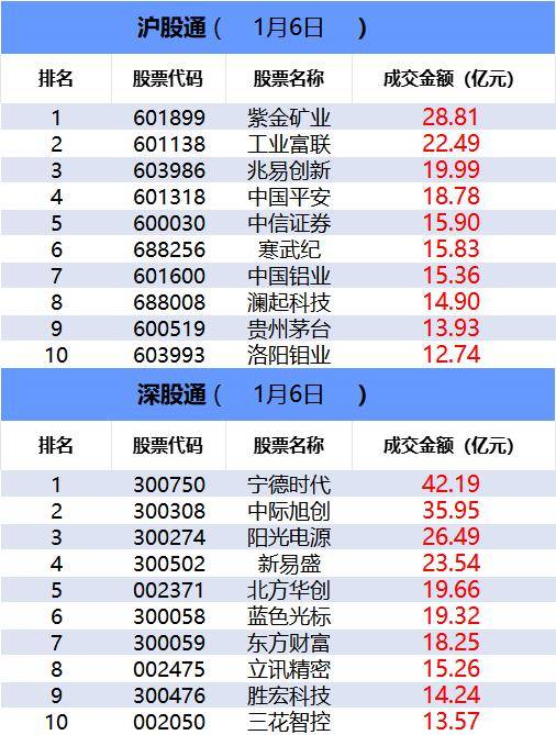 沪深股通成交概况 - 2026年1月6日,深股通总成交金额为1706.46亿元,沪股通总成交金额为1479.45亿元 [2] - 沪股通前十大成交个股中,紫金矿业成交额居首,达28.81亿元,工业富联和兆易创新分别以22.49亿元和19.99亿元位列第二、三位 [3] - 深股通前十大成交个股中,宁德时代成交额居首,达42.19亿元,中际旭创和阳光电源分别以35.95亿元和26.49亿元位列第二、三位 [3] 板块资金流向 - 从板块表现看,脑机接口、保险、化工、证券等板块涨幅居前 [4] - 主力资金净流入前五的板块分别为:非银金融(净流入70.47亿元,净流入率5.69%)、证券(净流入67.13亿元,净流入率7.25%)、有色金属(净流入61.60亿元,净流入率3.15%)、光学光电子(净流入33.24亿元,净流入率5.79%)、交运设备(净流入24.73亿元,净流入率1.80%) [5] - 主力资金净流出前五的板块分别为:通信(净流出115.66亿元,净流出率-7.54%)、文化传媒(净流出54.81亿元,净流出率-5.75%)、机械设备(净流出42.52亿元,净流出率-1.88%)、医药(净流出29.71亿元,净流出率-2.45%)、通用设备(净流出12.77亿元,净流出率-1.13%) [6] 个股资金流向 - 主力资金净流入前十的个股中,东方财富净流入28.58亿元(净流入率12.78%)居首,山子高科净流入14.56亿元(净流入率27.98%)位列第二 [7] - 主力资金净流出前十的个股中,中际旭创净流出26.67亿元(净流出率-13.17%)居首,新易盛净流出22.88亿元(净流出率-13.70%)位列第二 [8] ETF成交动态 - 今日成交额前十的ETF中,香港证券ETF易方达(513090)成交额216.008亿元居首,环比增长97.21%,当日上涨5.9326% [9] - 成交额环比增长前十的ETF中,恒生红利低波ETF易方达(159545)环比增长343.07%居首,电力ETF(159611)环比增长296.54%位列第二 [10] - 证券相关ETF成交活跃,证券ETF(512880)成交额62.011亿元,环比增长112.94%,当日上涨4.1296% [9] 龙虎榜机构动向 - 机构买入方面,利欧股份获两家机构买入1.35亿元,海格通信获三家机构买入1.24亿元(同时一家机构卖出2403万元),道氏技术获两家机构买入9316万元 [12] - 机构卖出方面,通宇通讯遭两家机构卖出2.38亿元,应流股份遭三家机构卖出3.11亿元(同时两家机构买入1.35亿元) [12] 龙虎榜游资与量化资金动向 - 一线游资活跃,山子高科获国泰海通证券成都北一环路营业部买入1.08亿元、国泰海通证券上海海阳西路营业部买入1.01亿元,道氏技术获国盛证券宁波桑田路营业部买入1.42亿元 [1][14] - 量化资金活跃,山子高科获开源证券西安西大街营业部买入2.16亿元,同时获深股通买入1.51亿元 [1][15] - 商业航天概念股鲁信创投获银河证券大连黄河路营业部买入2.02亿元 [14]