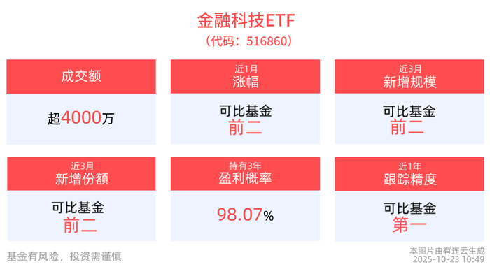 深圳市推动并购重组高质量发展行动方案(2025—2027年)。在集成电路、人工智能、新能源、生物医 药等战略性新兴产业领域,支持"链主"企业、龙头上市公司等开展上下游并购重组,收购有助于强链补 链和提升关键技术水平的优质未盈利资产,推动重点产业集群能级提升。 截至2025年10月23日 10:49,中证金融科技主题指数下跌0.91%。成分股方面涨跌互现,格尔软件领涨 10.03%,润和软件上涨3.05%,中亦科技上涨1.22%;东信和平领跌6.52%,中科金财下跌5.17%,恒宝 股份下跌4.53%。金融科技ETF(516860)下跌0.88%,最新报价1.46元。拉长时间看,截至2025年10月22 日,金融科技ETF近3月累计上涨2.94%,涨幅排名可比基金2/6。 流动性方面,金融科技ETF盘中换手1.8%,成交4215.27万元。拉长时间看,截至10月22日,金融科技 ETF近1月日均成交2.08亿元,居可比基金前2。 (文中个股仅作示例,不构成实际投资建议。基金有风险,投资需谨慎。) 以上产品风险等级为:中高 (此为管理人评级,具体销售以各代销机构评级为准) 风险提示:基金不同于银行储蓄和债券等固定 ...