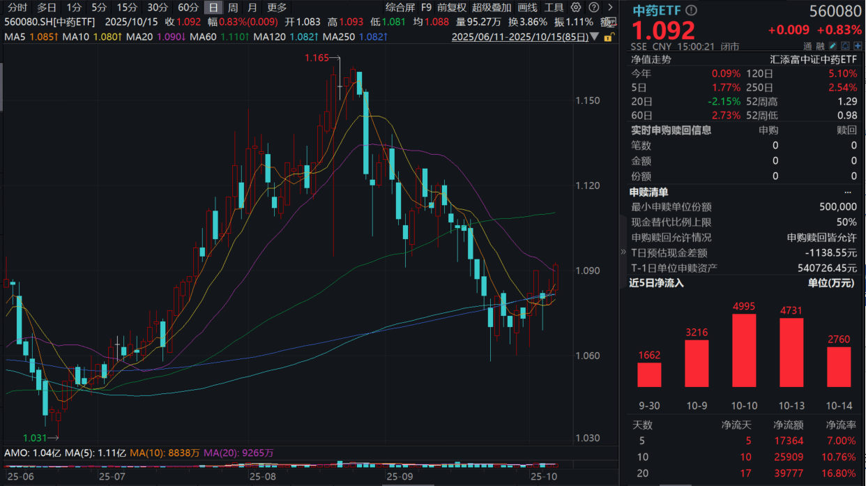 中药ETF(560080)市场表现 - 10月13日收盘下跌近1%,全天成交额超1.1亿元 [1] - 全天持续溢价,连续8天获资金净流入,近10日合计净流入超1.7亿元,最新规模近24亿元,在同类产品中断层领先 [1] - 基金最新融资余额超8400万元,融资余额保持历史高位 [7] 标的指数及成分股表现 - 标的指数成分股多数下跌,吉林敖东下跌1.44%、云南白药下跌1.01%、片仔癀下跌1.03%、东阿阿胶下跌1.22% [3][4] - 截至10月13日收盘,中药指数年内收益为负值(-3.27%),2024年指数下跌8.13%,2023年微涨0.27%,2022年下跌11.65% [4] - 指数市盈率TTM为25.11,处于近10年22.28%分位点,显示估值性价比更高 [6] 行业基本面与机构观点 - 渠道调整已接近尾声,多数企业渠道库存已处于常规水平,看好第四季度旺季需求逐步回暖 [9] - 全国中成药集采扩围接续落地温和,随着外部环境影响缓和,第三季度院内品种持续恢复 [9] - 中药配方颗粒领域,国标切换持续推进,集采影响或将边际减弱,部分企业逐步恢复 [9] 中药行业创新与政策支持 - 2025年1-9月,CDE新增92项中药IND申请,其中70项为1类新药;新增42项中药NDA申请,其中12项为1类新药 [10] - 2024年全年中药1类新药NDA共11项,2025年前9月已达12项,显示新药申请数量呈上升趋势 [10] - 政策端持续支持中医药发展,如2019年10月发布的《关于促进中医药传承创新发展的意见》 [10] - 部分上市公司新药进展不断,如方盛制药养血祛风止痛颗粒获批、天士力生物创新药普佑克新增适应症,创新管线有望带来重要增量 [12]