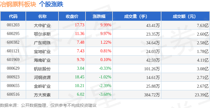 板块整体表现 - 冶钢原料板块在10月30日整体表现强劲,较上一交易日上涨2.1%,显著跑赢大盘指数[1] - 当日上证指数下跌0.73%至3986.9点,深证成指下跌1.16%至13532.13点,凸显板块逆市上涨的强势[1] - 板块整体资金面呈现分化,主力资金净流出2.78亿元,但游资和散户资金分别净流入4069.33万元和2.37亿元[1] 领涨个股分析 - 大中矿业(001203)领涨板块,股价涨停,涨幅达9.99%,收盘价为17.73元,成交量为43.41万手,成交额为7.63亿元[1] - 鄂尔多斯(600295)同样表现突出,涨幅达9.97%,收盘价为11.36元,成交量为23.35万手,成交额为2.60亿元[1] - 大中矿业获得主力资金净流入3771.22万元,主力净占比为4.94%[2] - 鄂尔多斯获得主力资金净流入5837.34万元,为板块内最高,主力净占比高达22.44%[2] 个股资金流向 - 河钢资源(000923)和宝地矿业(601121)分别获得主力资金净流入1173.24万元和986.59万元,主力净占比分别为4.33%和5.54%[2] - 广东明珠(600382)虽涨幅仅1.22%,但获得游资大力追捧,游资净流入1837.74万元,游资净占比达7.12%[2] - 方大炭素(600516)资金流出显著,主力资金净流出3.25亿元,主力净占比为-13.92%,但获得游资净流入6903.48万元[2] - 金岭矿业(000655)和海南矿业(601969)主力资金净流出较大,分别为3846.90万元和3421.00万元[2]