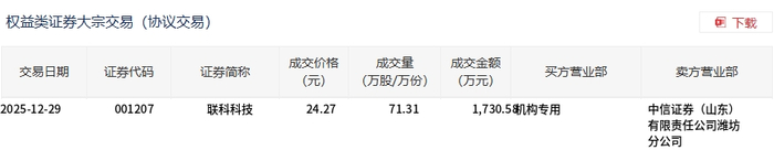 大宗交易概况 - 2025年12月29日,联科科技发生一笔大宗交易,成交量为71.31万股,成交金额为1730.58万元,占该股当日总成交额的16.33% [1] - 该笔大宗交易的成交价格为24.27元,相较于当日市场收盘价24.77元,折价幅度为2.02% [1] 交易细节 - 该笔交易为权益类证券大宗交易(协议交易),证券代码为001207,证券简称为联科科技 [2] - 交易买方营业部为“机构专用”,卖方营业部为“中信证券(山东)有限责任公司潍坊分公司” [2]