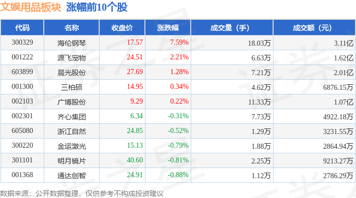 | 代码 | 名称 | 收盘价 | 涨跌幅 | 成交量(手) | 成交额(元) | | --- | --- | --- | --- | --- | --- | | 001238 | 浙江正特 | 49.33 | -3.08% | 8368.0 | 4190.98万 | | 301011 | 华立科技 | 25.65 | -2.88% | 3.24万 | 8356.58万 | | 002862 | 实丰文化 | 17.51 | -2.78% | 4.70万 | 8309.58万 | | 300703 | 创源股份 | 27.41 | -2.42% | 6.67万 | 1.84亿 | | 301335 | 天元宠物 | 29.22 | -2.21% | 2.26万 | 6656.51万 | | 002678 | 珠江钢琴 | 4.99 | -2.16% | 42.16万 | 2.13亿 | | 002575 | 群兴玩具 | 6.07 | -2.10% | 24.94万 | 1.53亿 | | 002348 | 高乐股份 | 4.27 | -1.61% | 18.20万 | 7816.30万 | | 002899 ...