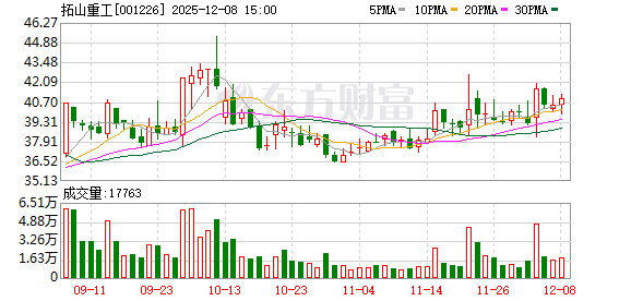 12月12日,拓山重工大宗交易成交30万股,成交额1113.9万元,占当日总成交额的5.78%,成交价37.13 元,较市场收盘价43.02元折价13.69%。 | 交易日期 | 证券代码 | 证券简称 | 成交价格 | 成交量 | 成交金额 买方营业部 | 卖方营业部 | | --- | --- | --- | --- | --- | --- | --- | | | | | (元) | (万股/万份) | (万元) | | | 2025-12-12 | 001226 | 拓山重工 | 37.13 | 15.00 | 556.95 招商证券股份有限 | 民生证券股份有限 | | | | | | | 公司东莞虎门连升 | 公司安徽分公司 | | | | | | | 路正券营业部 | | | 2025-12-12 | 001226 | 拓山重工 | 37.13 | 15.00 | 556.95 招商证券股份有限 | 光大证券股份有限 | | | | | | | 公司东莞虎门连升 | 公司金华宾虹路证 | | | | | | | 路正券营业部 | 券营业部 | ...