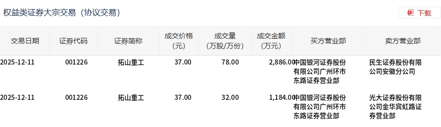12月11日,拓山重工大宗交易成交110万股,成交额4070万元,占当日总成交额的29.87%,成交价37元,较市场收盘价41.25 元折价10.3%。 | 交易日期 | 证券代码 | 证券简称 | 成交价格 | 成交量 | 成交全额 买方营业部 | 卖方营业部 | | --- | --- | --- | --- | --- | --- | --- | | | | | (元) | (万股/万份) | (万元) | | | 2025-12-11 | 001226 | 拓山重工 | 37.00 | 78.00 | 2,886.00中国银河证券股份 | 民生证券股份有限 | | | | | | | 有限公司广州环节 | 公司安徽分公司 | | | | | | | 东路证券营业部 | | | 2025-12-11 | 001226 | 拓山重工 | 37.00 | 32.00 | 1,184.00中国银河证券股份 | 光大证券股份有限 | | | | | | | 有限公司广州环市 | 公司金华宾如影证 | | | | | | | 东路证券营业部 | 券营业部 | ...