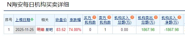 龙虎榜数据显示,卖出海安集团金额最大的前五名中,有1家机构专用席位。经统计,机构席位今日卖出海安集团净额为1867.98万元。 中国经济网北京11月25日讯 海安集团(001233.SZ)今日在深交所主板上市,截至收盘报83.52元,涨幅74.00%,总市值155.32亿元。 | 买入金额最大的前5名 | | --- | | 序号 | 交易营业部名称 | | 买入金额(万) | 占总成交比例 | 卖出金额(万) | | --- | --- | --- | --- | --- | --- | | | 东方财富证券股份有限公司拉萨团结路第二证券营业部 | 367次 30.52% | 3159.73 | 1.37% | 1232.75 | | 2 | 东方财富证券股份有限公司拉萨团结路第一证券营业部 | 551次 30.31% | 2701.64 | 1.17% | 1310.57 | | 3 | 国金证券股份有限公司深圳分公司 | 226次 29.65% | 2464.06 | 1.07% | 195.53 | | ব | 东方财富证券股份有限公司拉萨金融城南环路证券营业部 | 461次 29.72% | 245 ...