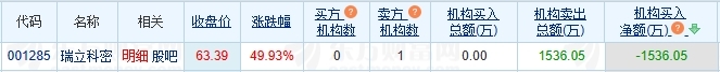 中国经济网北京9月30日讯瑞立科密(001285.SZ)今日在深交所主板上市,截至收盘报63.39元,涨幅49.93%。 | 代码 | 名称 | 相关 | 收盘价 | 张跌幅 | 买方 6 | 卖方 0 | 机构买入 | 机构荧出 | 机构买入 | | --- | --- | --- | --- | --- | --- | --- | --- | --- | --- | | | | | | | 机构数 | | 点额(万) | 鳥额(万) | 净额(万) 3 � | | 001285 瑞立科密 明细 股吧 63.39 | | | | 49.93% | | | 0.00 | 1536.05 | -1536.05 | | 买入金额最大的前5名 | | | | | | | | | --- | --- | --- | --- | --- | --- | --- | --- | | 序号 | 交易营业部名称 | | | 买入金额(万) | 占总成交比例 | 卖出会额(万) | 占总成交比例 | | 1 | 东方财富证券股份有限公司拉萨团结路第一证券营业部 | 757次 28.01% | 2 | 2766.91 | 1.4 ...
