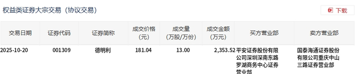 大宗交易概况 - 2025年10月24日,德明利发生大宗交易,总成交量为17.26万股,总成交金额为3744.04万元,占该股当日总成交额的0.76% [1] - 大宗交易成交价格为216.92元,与当日市场收盘价216.92元持平 [1] 交易明细分析 - 当日共发生两笔大宗交易,第一笔成交量为3.26万股,成交金额为707.16万元,买方营业部为国信证券股份有限公司上海浦东分公司,卖方营业部为兴业证券股份有限公司湖南分公司 [2] - 第二笔成交量为14.00万股,成交金额为3036.88万元,买方营业部为平安证券股份有限公司深圳深南东路罗湖商务中心证券营业部,卖方营业部为国泰君安证券股份有限公司重庆中山三路证券营业部 [2]
