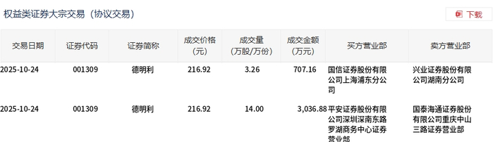 大宗交易概况 - 2025年10月24日,德明利发生大宗交易,总成交量为17.26万股,总成交金额为3744.04万元,占该股当日总成交额的0.76% [1] - 大宗交易成交价格为216.92元,与当日市场收盘价216.92元持平 [1] 交易明细分析 - 当日共发生两笔大宗交易,第一笔成交量为3.26万股,成交金额为707.16万元,买方营业部为国信证券股份有限公司上海浦东分公司,卖方营业部为兴业证券股份有限公司湖南分公司 [2] - 第二笔成交量为14.00万股,成交金额为3036.88万元,买方营业部为平安证券股份有限公司深圳深南东路罗湖商务中心证券营业部,卖方营业部为国泰君安证券股份有限公司重庆中山三路证券营业部 [2]