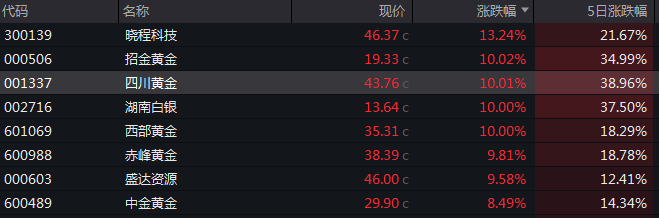 编辑丨张伟贤 随着国际金价的突破上行,黄金股重获市场青睐。 1月21日午后,现货黄金价格一度升至 4888美元/盎司,月度涨幅超过13%,逼近5000美元整 数价位 。 商品、股票市场共振之下,黄金股取得了更为突出的涨幅,当天四川黄金、招金黄金等多只 贵金属板块个股涨停, 其中四川黄金月度涨幅已经扩大至57%,创出公司2023年上市以来的 历史新高 。 | 代码 | 名称 | 现价 | 涨跌幅 | 5日涨跌幅 | | --- | --- | --- | --- | --- | | 300139 | 膀程科技 | 46.37 c | 13.24% | 21.67% | | 000506 | 招金黄金 | 19.33 c | 10.02% | 34.99% | | 001337 | 四川黄金 | 43.76 c | 10.01% | 38.96% | | 002716 | 湖南白银 | 13.64 c | 10.00% | 37.50% | | 601069 | 世部黄金 | 35.31 c | 10.00% | 18.29% | | 600988 | 赤峰黄金 | 38.39 c | 9.81% | 18.78 ...