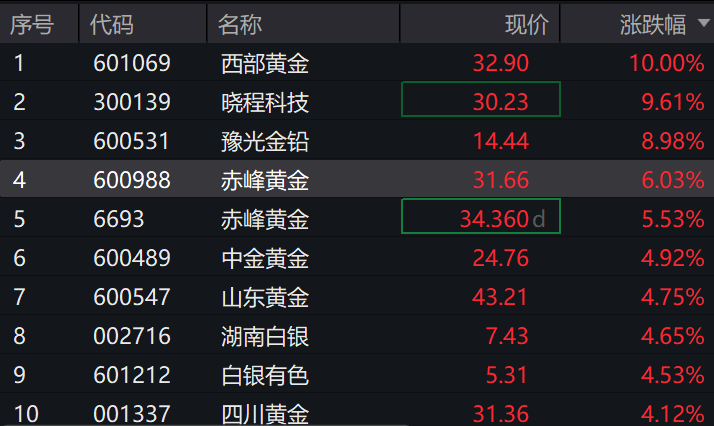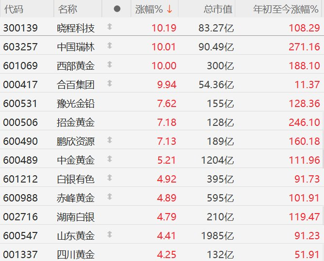 格隆汇10月13日|A股市场黄金概念股午后进一步拉升,其中,晓程科技涨超10%,西部黄金拉升涨 停,合百集团、中国瑞林此前涨停,豫光金铅、招金黄金、鹏欣资源涨超7%,中金黄金涨超5%,白银 有色、赤峰黄金、湖南白银、山东黄金、四川黄金涨超4%。 消息面上,中美贸易摩擦升级,国际金价续涨,现货黄金升至4074美元/盎司,再创历史新高。现货黄 金年内累涨超55%。 | 代码 | 名称 | | 涨幅% ↓ | 总市值 | 年初至今涨幅%。 | | --- | --- | --- | --- | --- | --- | | 300139 | 晓程科技 | 1 | 10.19 | 83.27亿 | 108.29 | | 603257 | 中国瑞林 | 1 | 10.01 | 90.49亿 | 271.16 | | 601069 | 西部黄金 | 1 | 10.00 | 300亿 | 188.10 | | 000417 | 合百集团 | 1 | 9.94 | 54.36亿 | 11.37 | | 600531 | 豫光金铅 | | 7.62 | 155亿 | 128.36 | | 000506 | 招金黄金 | | 7. ...