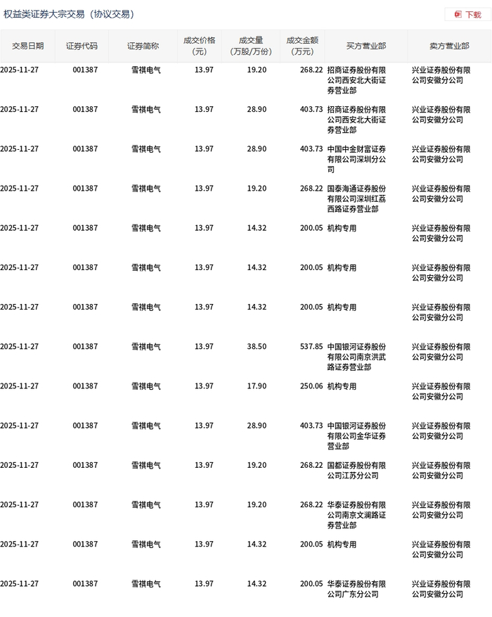大宗交易概况 - 2025年11月27日,雪祺电气发生大宗交易,总成交量为291.5万股,总成交额为4072.23万元,占该股当日总成交额的8.81% [1] - 本次大宗交易的成交价格为每股13.97元,较当日市场收盘价16.52元折价15.44% [1] 交易明细分析 - 当日共发生14笔大宗交易,所有交易的成交价格均为13.97元,卖方营业部均为兴业证券股份有限公司安徽分公司 [2] - 买方营业部较为分散,涉及招商证券、中国中金财富证券、国泰海通证券、中国银河证券、国都证券、华泰证券等多家券商的营业部,其中“机构专用”席位出现了5笔交易 [2] - 单笔成交量在14.32万股至38.50万股之间,单笔成交额在200.05万元至537.85万元之间 [2] - 最大的一笔交易成交量为38.50万股,成交额为537.85万元,买方为中国银河证券股份有限公司南京洪武路证券营业部 [2]