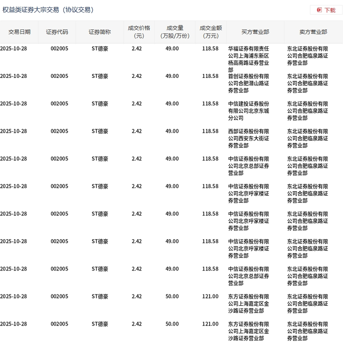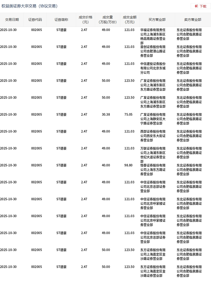 | 交易日期 | 证券代码 | 证券简称 | 成交价格 | 成交量 | 成交金额 | 买方营业部 | 卖方营业部 | | --- | --- | --- | --- | --- | --- | --- | --- | | | | | (元) | (万股/万份) | (万元) | | | | 2025-10-30 | 002005 | ST德豪 | 2.47 | 49.00 | 121.03 | 华福证券有限责任 | 东北证券股份有限 | | | | | | | | 公司上海浦东新区 | 公司合肥临泉路证 | | | | | | | | 杨高南路证券营业 | 券营业部 | | 2025-10-30 | 002005 | ST德景 | 2.47 | 49.00 | 121.03 | =R 首创证券股份有限 | 东北证券股份有限 | | | | | | | | 公司合肥潜山路证 | 公司合肥临泉路证 | | | | | | | | 券营业部 | 券营业部 | | 2025-10-30 | 002005 | ST德豪 | 2.47 | 49.00 | 121.03 | 中信建投证券股份 | 东北证券股份有限 | | ...