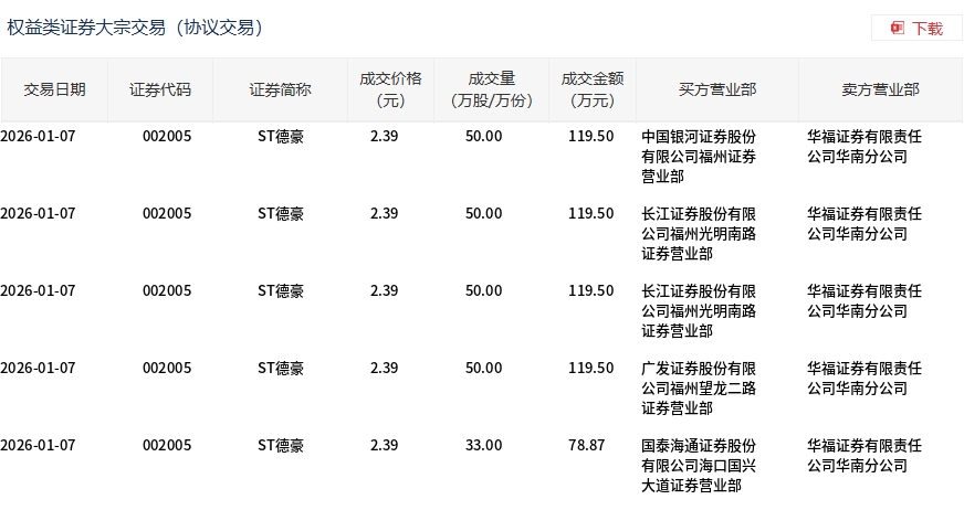 大宗交易概况 - 2026年1月7日,ST德豪发生大宗交易,总成交233万股,总成交额556.87万元,占该股当日总成交额的14.96% [1] - 大宗交易成交均价为2.39元,较当日市场收盘价2.5元折价4.4% [1] 交易明细分析 - 当日共发生5笔大宗交易,每笔成交价格均为2.39元 [2] - 其中4笔交易的单笔成交量为50万股,单笔成交额为119.50万元;另1笔交易成交量为33万股,成交额为78.87万元 [2] - 所有5笔交易的卖方营业部均为华福证券有限责任公司华南分公司 [2] - 买方营业部分别来自中国银河证券股份有限公司福州证券营业部、长江证券股份有限公司福州光明南路证券营业部(两笔)、广发证券股份有限公司福州望龙二路证券营业部以及国泰君安证券股份有限公司海口国兴大道证券营业部 [2]