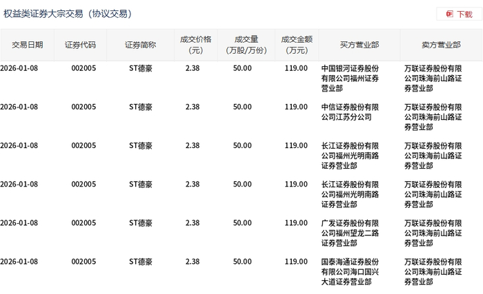 大宗交易概况 - 2026年1月8日,ST德豪发生大宗交易,总成交300万股,总成交金额714万元,占该股当日总成交额的9.25% [1] - 本次大宗交易成交价格为每股2.38元,较当日市场收盘价2.63元折价9.51% [1] 交易明细分析 - 当日共发生6笔大宗交易,每笔成交量均为50万股,成交金额均为119万元,成交价格均为2.38元 [2] - 所有6笔交易的卖方营业部均为万联证券股份有限公司珠海前山路证券营业部 [2] - 买方营业部分别来自中国银河证券股份有限公司福州证券营业部、中信证券股份有限公司江苏分公司、长江证券股份有限公司福州光明南路证券营业部(两笔)、广发证券股份有限公司福州望龙二路证券营业部以及国泰海通证券股份有限公司海口国兴大道证券营业部 [2]