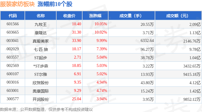 板块整体表现 - 服装家纺板块在11月12日整体上涨1.22%,表现强于大盘,当日上证指数下跌0.07%,深证成指下跌0.36% [1] - 板块内个股表现分化,九牧王以10.05%的涨幅领涨,而洪兴股份以-10.00%的跌幅领跌 [1][2] 领涨个股表现 - 九牧王收盘价为10.40元,涨幅10.05%,成交量为20.55万手,成交额为2.09亿元 [1] - 康隆达收盘价为31.30元,涨幅10.02%,成交量为3.71万手,成交额为1.13亿元 [1] - 真爱美家收盘价为33.90元,涨幅9.99%,成交量为6332.64手,成交额为2146.76万元 [1] - 七匹狼收盘价为10.17元,涨幅7.39%,成交量为96.27万手,成交额为9.78亿元 [1] 领跌个股表现 - 洪兴股份收盘价为23.50元,跌幅10.00%,成交量为18.50万手,成交额为4.40亿元 [2] - 万里马收盘价为11.75元,跌幅5.39%,成交量为103.78万手,成交额为12.43亿元 [2] - 扬州金泉收盘价为43.52元,跌幅2.57%,成交量为4.86万手,成交额为3774.33万元 [2] 板块资金流向 - 当日服装家纺板块主力资金净流入2.05亿元,游资资金净流出5096.86万元,散户资金净流出1.54亿元 [2] - 七匹狼主力资金净流入1.62亿元,主力净占比16.51%,为板块内主力资金净流入最高的个股 [3] - 欣贺股份主力资金净流入5712.00万元,主力净占比13.88% [3] - 九牧王主力资金净流入3922.79万元,主力净占比18.77% [3]