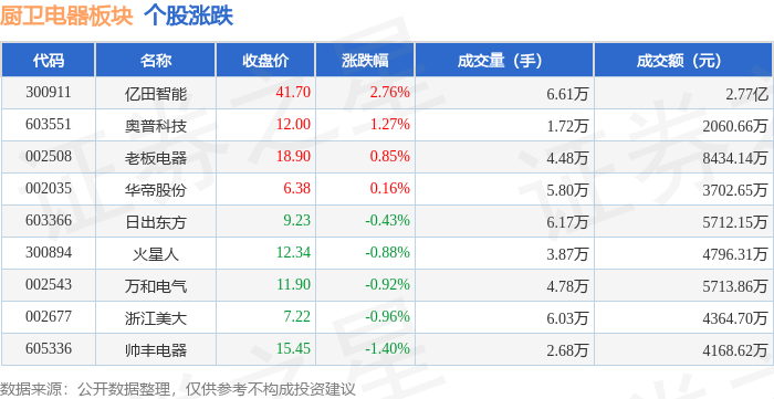 | 代码 | 名称 | 收盘价 | 涨跌幅 | 成交量(手) | 成交额(元) | | --- | --- | --- | --- | --- | --- | | 300911 | 亿田智能 | 41.70 | 2.76% | 6.61万 | 2.77亿 | | 603551 | 奥普科技 | 12.00 | 1.27% | 1.72万 | 2060.66万 | | 002508 | 老板电器 | 18.90 | 0.85% | 4.48万 | 8434.14万 | | 002035 | 华帝股份 | 6.38 | 0.16% | - 5.80万 | 3702.65万 | | 603366 | 日出东方 | 9.23 | -0.43% | 6.17万 | 5712.15万 | | 300894 | 火星人 | 12.34 | -0.88% | 3.87万 | 4796.31万 | | 002543 | 万和电气 | 11.90 | -0.92% | 4.78万 | 5713.86万 | | 002677 | 浙江美大 | 7.22 | -0.96% | 6.03万 | 4364.70万 | | 605336 ...
