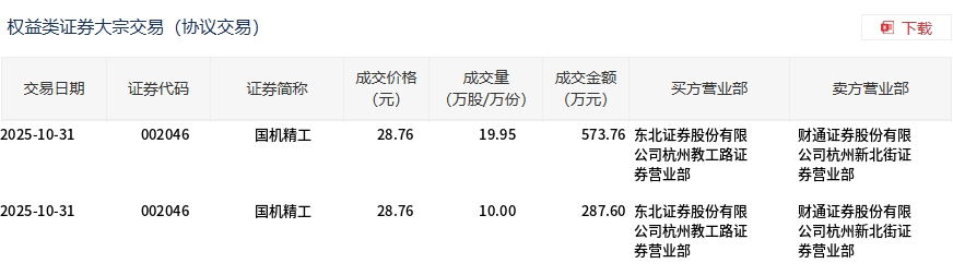 大宗交易概况 - 2025年10月31日,国机精工发生大宗交易,总成交量为29.95万股,总成交额为861.36万元,占当日总成交额的2.16% [1] - 成交价格为28.76元,较市场收盘价28.63元溢价0.45% [1] 交易明细分析 - 当日共发生两笔大宗交易,买方营业部均为东北证券股份有限公司杭州教工路证券营业部,卖方营业部均为财通证券股份有限公司杭州新北街证券营业部 [2] - 第一笔交易成交量为19.95万股,成交额为573.76万元 [2] - 第二笔交易成交量为10.00万股,成交额为287.60万元 [2]