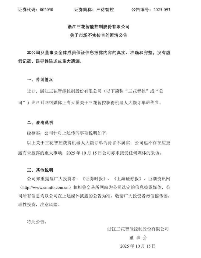 记者丨朱芷葵 赵云帆 编辑丨刘雪莹 骆一帆 10月15日晚,《辟谣财知道》注意到,三花智控(002050.SZ)公告称,近日关注到网络媒体上有大量 关于公司获得机器人大额订单的传言,经核实,该传言不属实;公司也不存在应披露而未披露的重大事 项;2025年10月15日公司亦未接受任何媒体的采访。 10月15日午后,三花智控(002050.SZ)A股直线拉升涨停,最新市值1821亿元。与此同时,三花智控 港股(2050.HK)也同步拉升,盘中一度涨超13%。截至收盘,A股报44.18元/股,涨10.01%,港股报 39.5港元/股,涨12.92%。截至10月15日收盘,三花智控本月仍跌8.78%。 此前曾"委婉"回应特斯拉订单 近日有报道称,三花智控已经获得特斯拉人形机器人大额订单,金额在50亿元以上。 10月15日下午,21世纪经济报道记者曾致电三花智控公司证券部,就获得特斯拉大额订单事项进行核 实。该公司证券部人士告诉记者,公司机器人业务进展顺利,但无法回应关于以上市场传言内容。 值得注意的是,2025年9月,公司"竞争对手",拓普集团董事长邬建树曾在一次机构交流中,对包括三 花智控在内的多家供应链企业发表了 ...