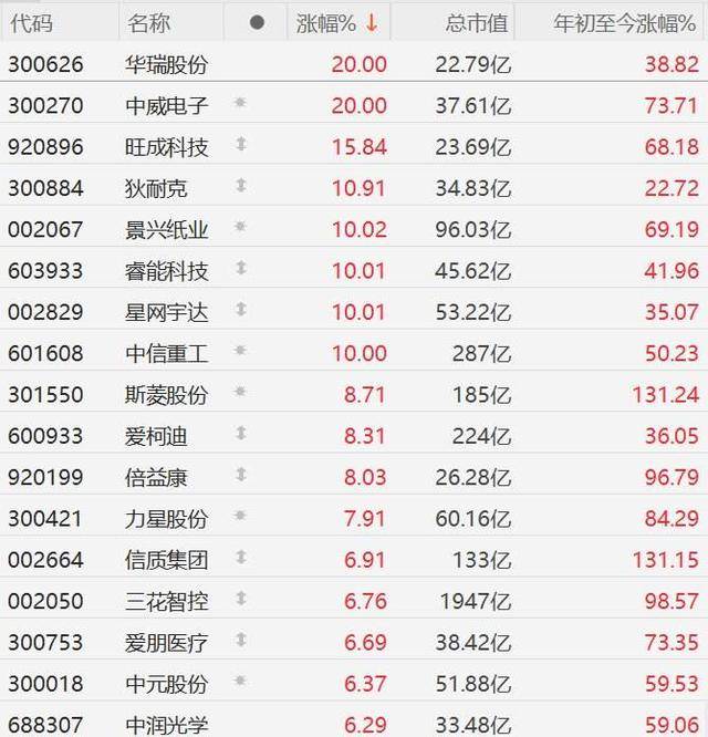 机器人概念股市场表现 - A股市场机器人概念股集体走强,多只股票出现显著上涨,其中华瑞股份、中威电子20CM涨停,旺成科技涨超15%,狄耐克涨近11% [1] - 景兴纸业、睿能科技、星网宇达、中信重工等多只股票10CM涨停,斯菱股份、爱柯迪、倍益康等涨超8% [1] - 力星股份涨超7%,信质集团、三花智控、爱朋医疗、中元股份、中润光学等多股涨超6% [1] 相关公司涨幅与市值 - 华瑞股份涨幅20.00%,总市值22.79亿元,年初至今涨幅38.82% [2] - 中威电子涨幅20.00%,总市值37.61亿元,年初至今涨幅73.71% [2] - 旺成科技涨幅15.84%,总市值23.69亿元,年初至今涨幅68.18% [2] - 狄耐克涨幅10.91%,总市值34.83亿元,中信重工涨幅10.00%,总市值287亿元 [2] 人形机器人行业前景 - 智元机器人合伙人王闯表示,人形机器人产业最终规模将比汽车产业更大,且不会由一两家龙头垄断 [1] - 智元机器人自称已是全球人形机器人出货量最大的企业,甚至超过马斯克公司的出货量 [1] - 智元机器人今年营收规模相比去年增长可能十倍不止,呈现指数级增长态势 [1]